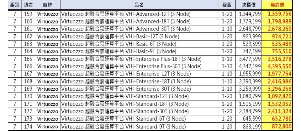 Virtuozzo 提供超融合基礎架構的雲平台解決方案於軟體共同供應契約-電腦軟體(1130201)標的決標組別與項次。